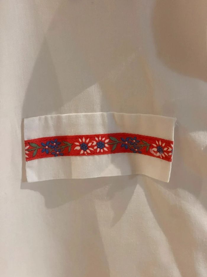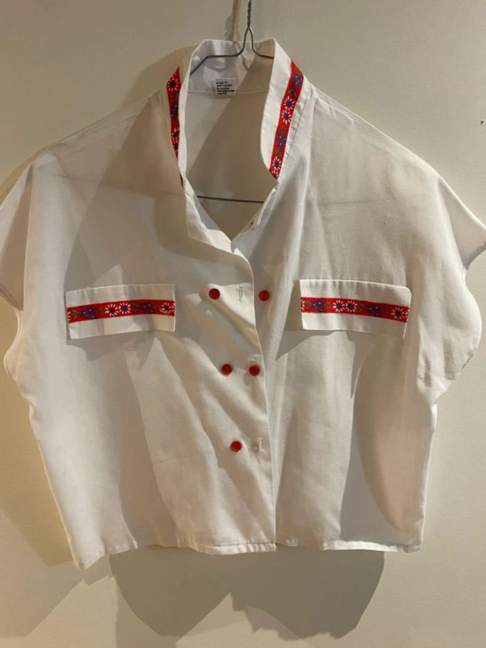 Chemise cropée blanche ample et courte confortable et super craquante avec ses manches courtes Les détails soignés: boutons rouges et Jolies broderies fleurs sur ruban rouge au niveau du col et des fausses poches poitrine Made in France 38/40