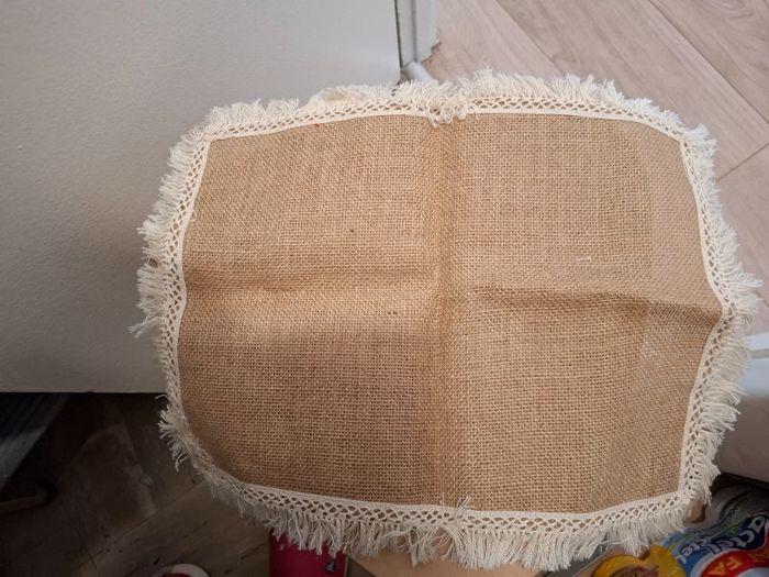 1 set de table mesure 41 cm largeur 33cm en toile marron avec franches ecru discret le sous verres mesure 12x12