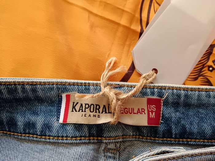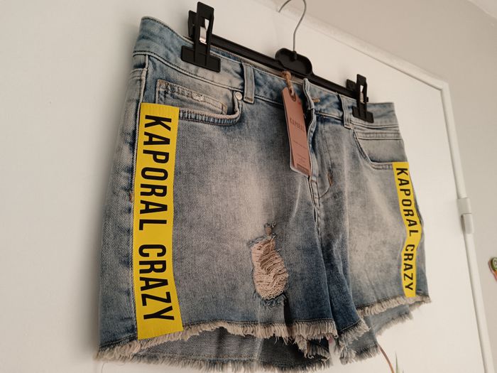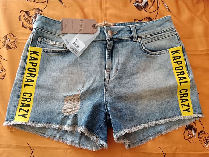 Magnifique short kaporal Taille M Fermeture éclair + bouton 2 poches devant et derrière Effet délavé/effilé avec 2 bandes jaune Bas efiler Largeur 40 cm Longueur 35 Matière 98% coton, 2% elasthanne Neuf avec étiquette, achat boutique 65€