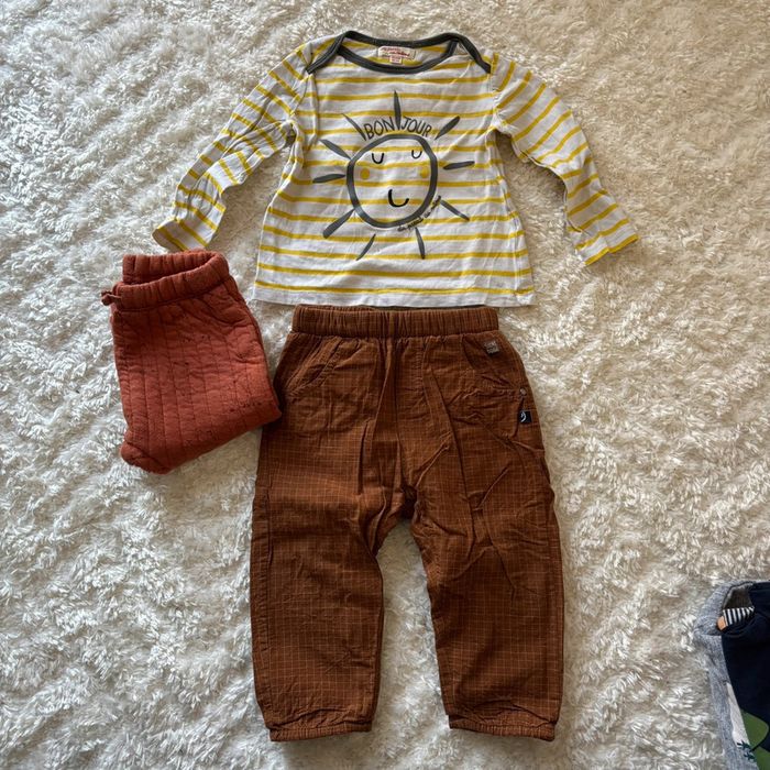 Un t shirt à manches longues 1 pantalon marron épais parfait état 1 pantalon marron/orange un peu usé sur un genou mais peut encore être porté pour traîner dehors 18 mois #chrisgrn18mois