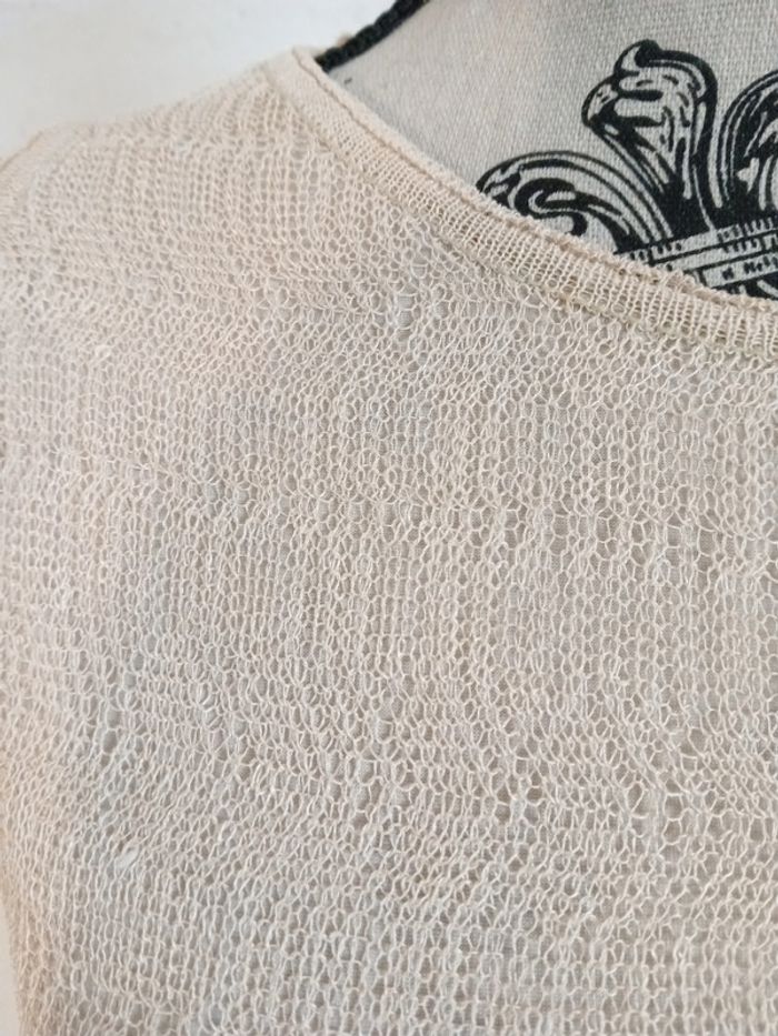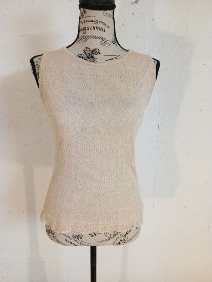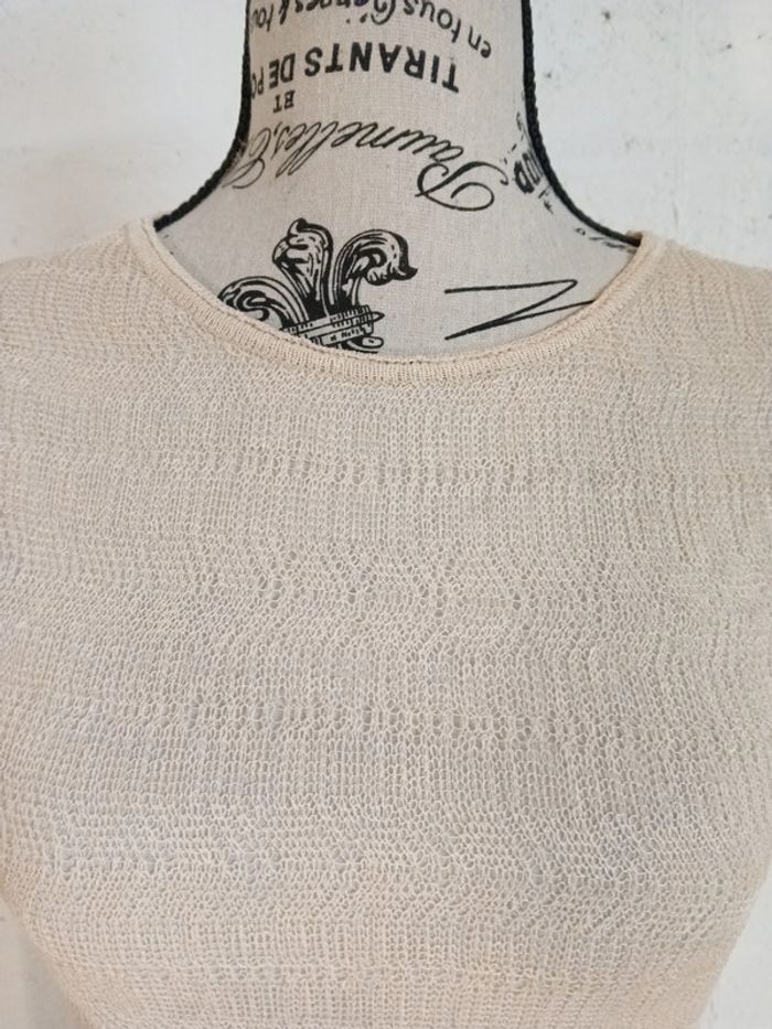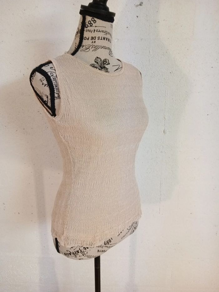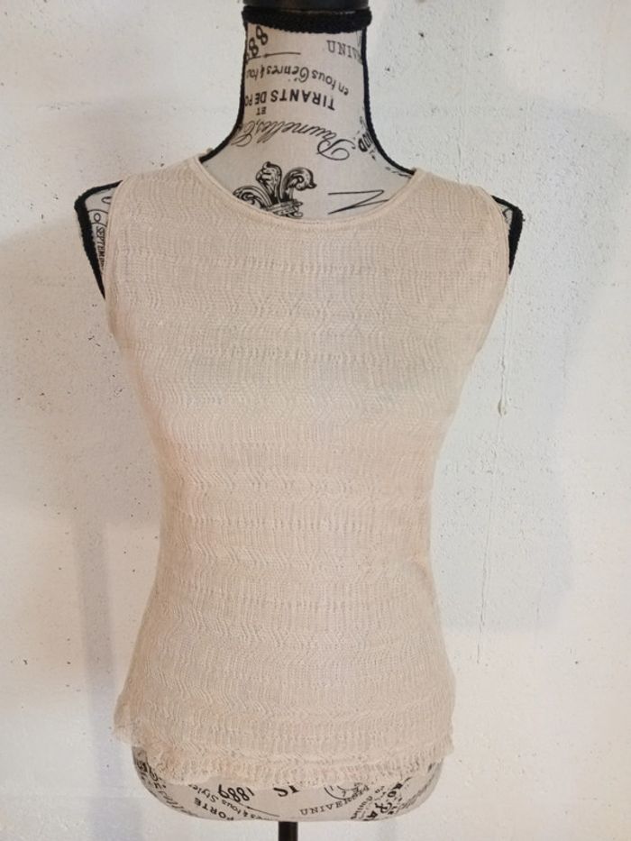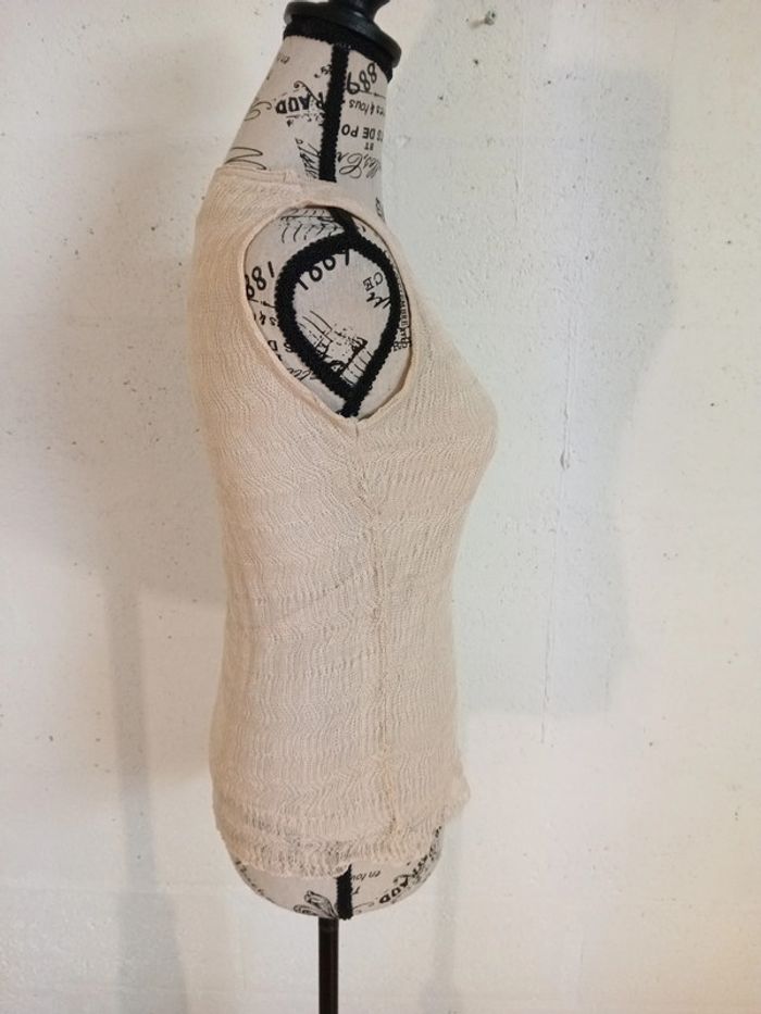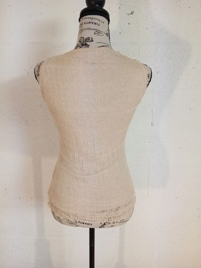 Débardeur beige très fine maille Doublé Marque Boxley Taille Xs Bon état Quelques mailles peuvent tout de même avoir quelques défauts mais superficiels Largeur aisselles 38 cm Longueur dos 56 cm Lin et polyamide