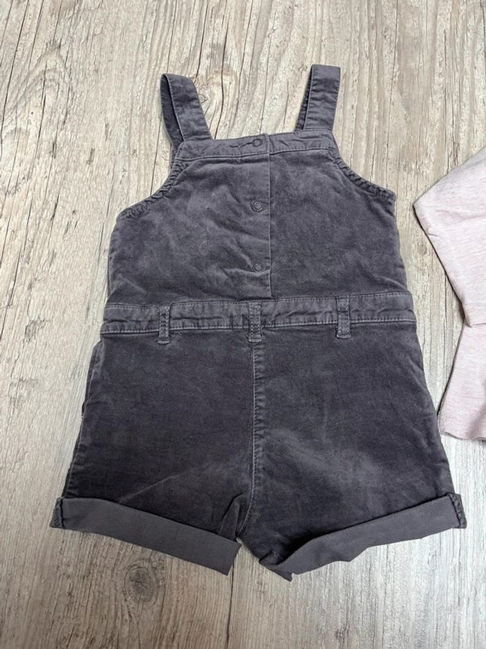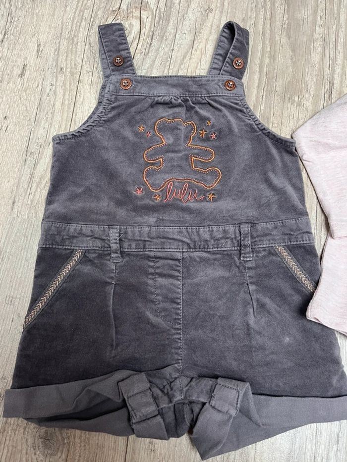 Ensemble composé d’une salopette short en velours taille 18 mois qui s’ouvre à l’entrejambe en très bon état Et d’un haut rose qui présente de très légères taches (voir photos) #skarli18moisf