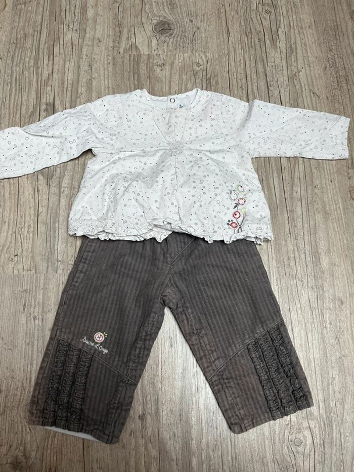 En bon état Pantalon en velours qui s’ouvre à l’entrejambe Et haut avec légère trace rose (voir photo) #skarlifille1an