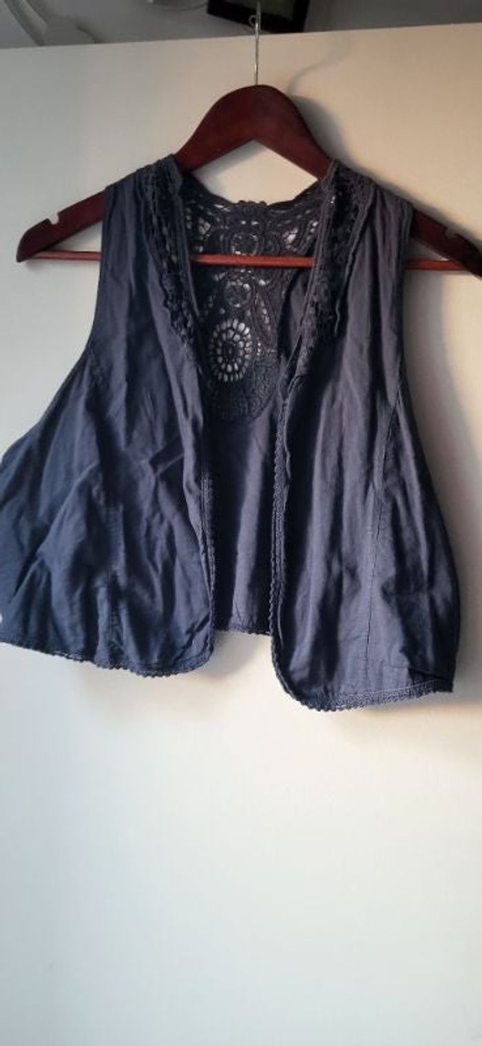 Magnifique gilet bleu foncé. 100%coton. Cache-cache. Taille unique. ( taille 4 : de 38 à 42) Aisselle à Aisselle : 65cm Longeur total : 50cm