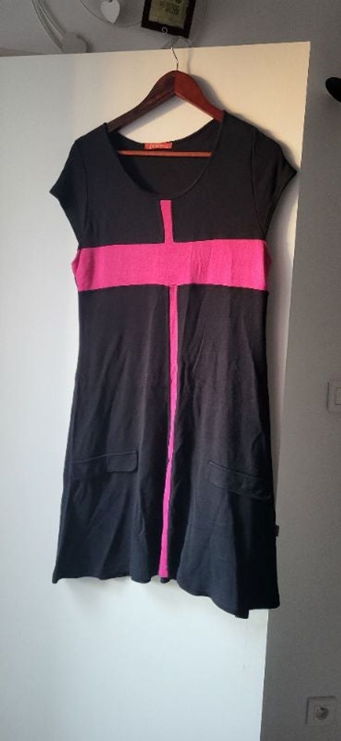 Magnifique robe noire et rose. Taille 42-44. En très bon état. Forme patineuse. Marque poetic. Aisselle à Aisselle : 45cm Taille à plat : 47cm Longeur total : 86cm