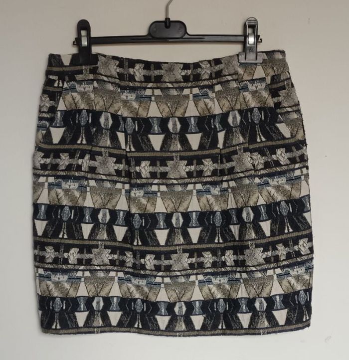 Jupe courte hauteur 45 cm. Taille 40 indiquée mais convient plutôt pour du 38. Poches côtés. Blanc / crème, marine et fil lurex or.