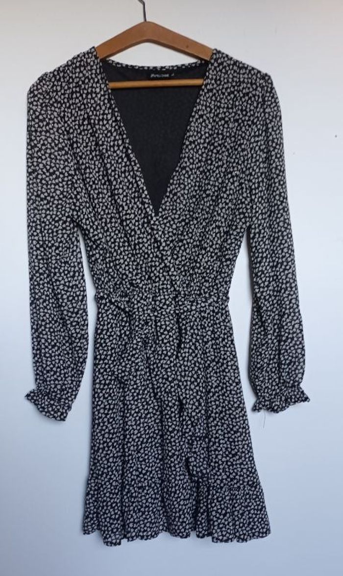 Robe avec volant au bas, aux manches et à l'avant. Tissu motif petits cœurs et pailleté or. Ceinture à nouer. Effet croisé portefeuille. Taille L mais convient pour un 38. Excellent état