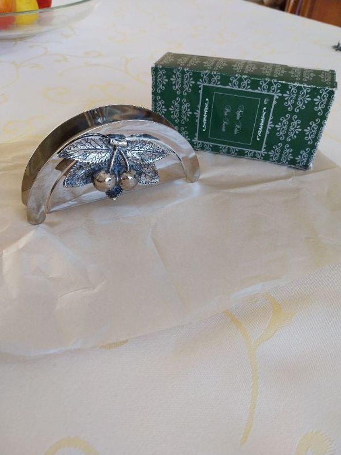 Porte serviettes de table vintage en métal argenté , morif cerise,avec sa boîte, 15 cm longueur sur 8cm hauteur en très bon état,