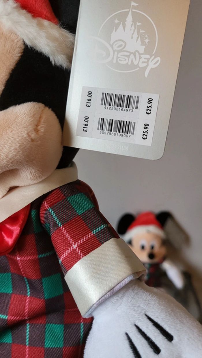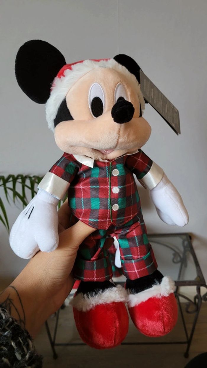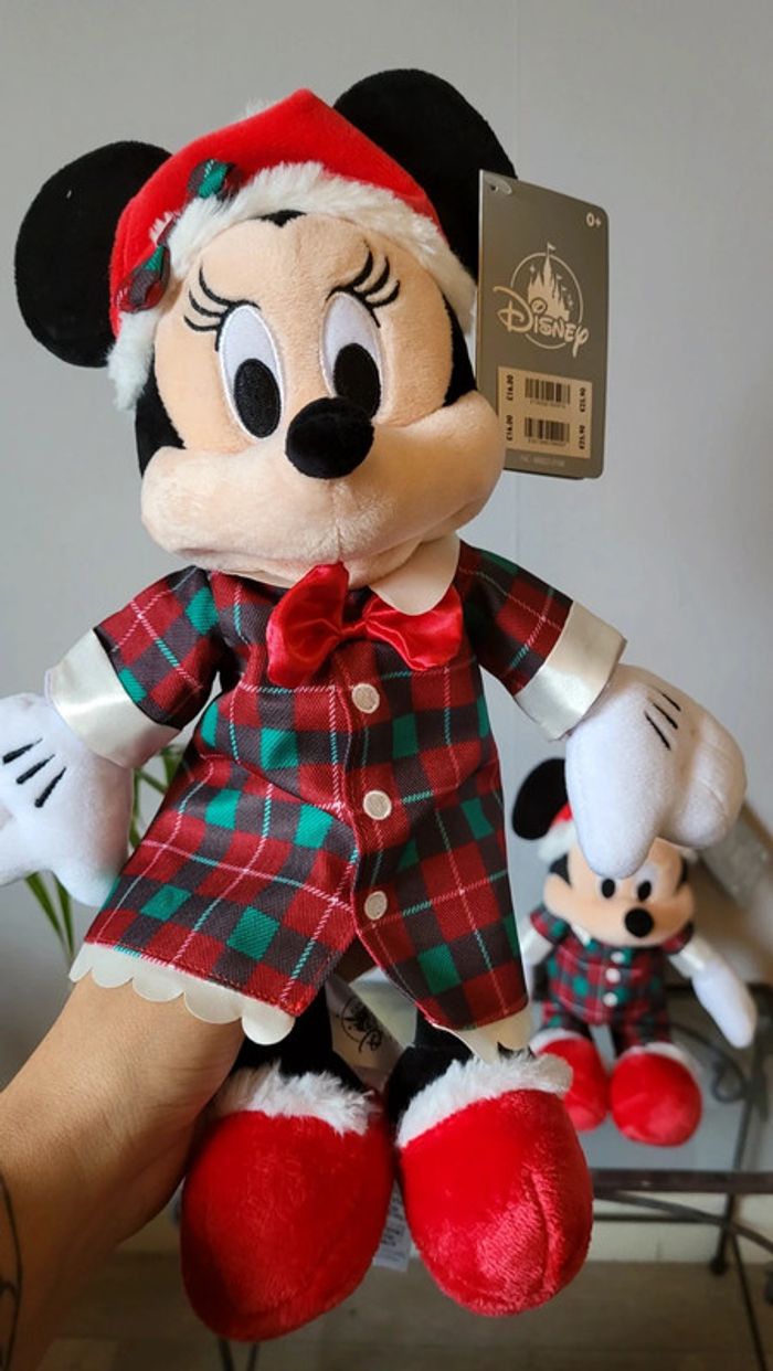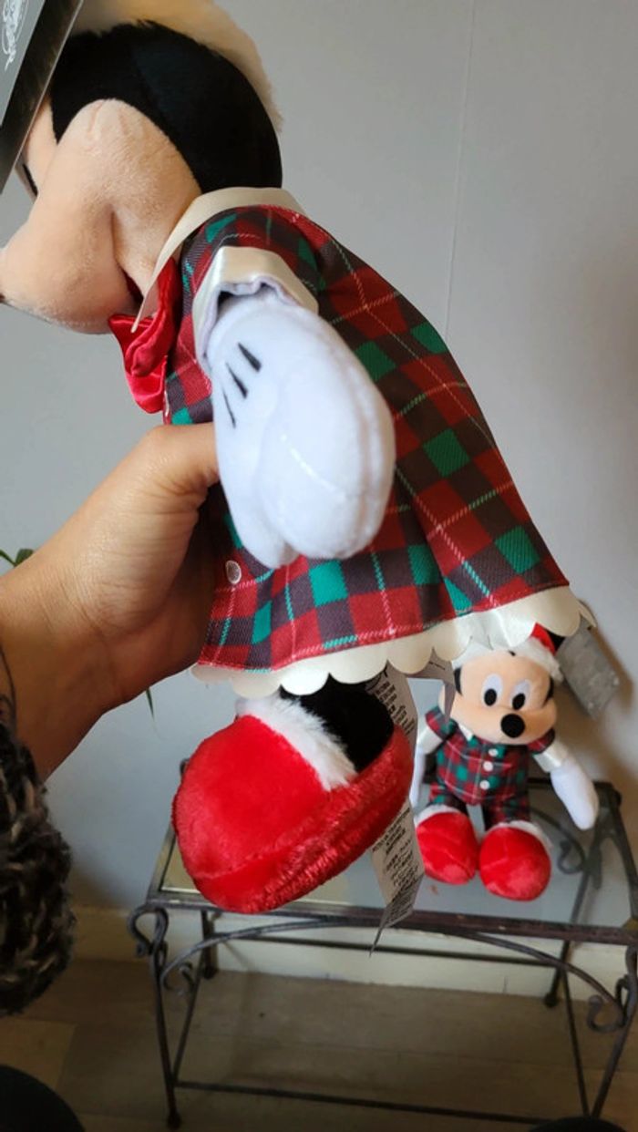 Vends lot de peluches Mickey et Minnie. Vendus ensemble uniquement. Collection Noël . Neufs avec etiquette. Disney Store. Mesurent environs 3o cm.