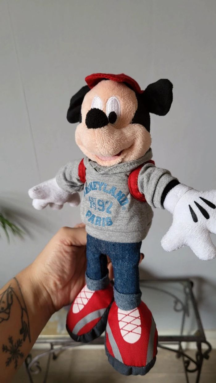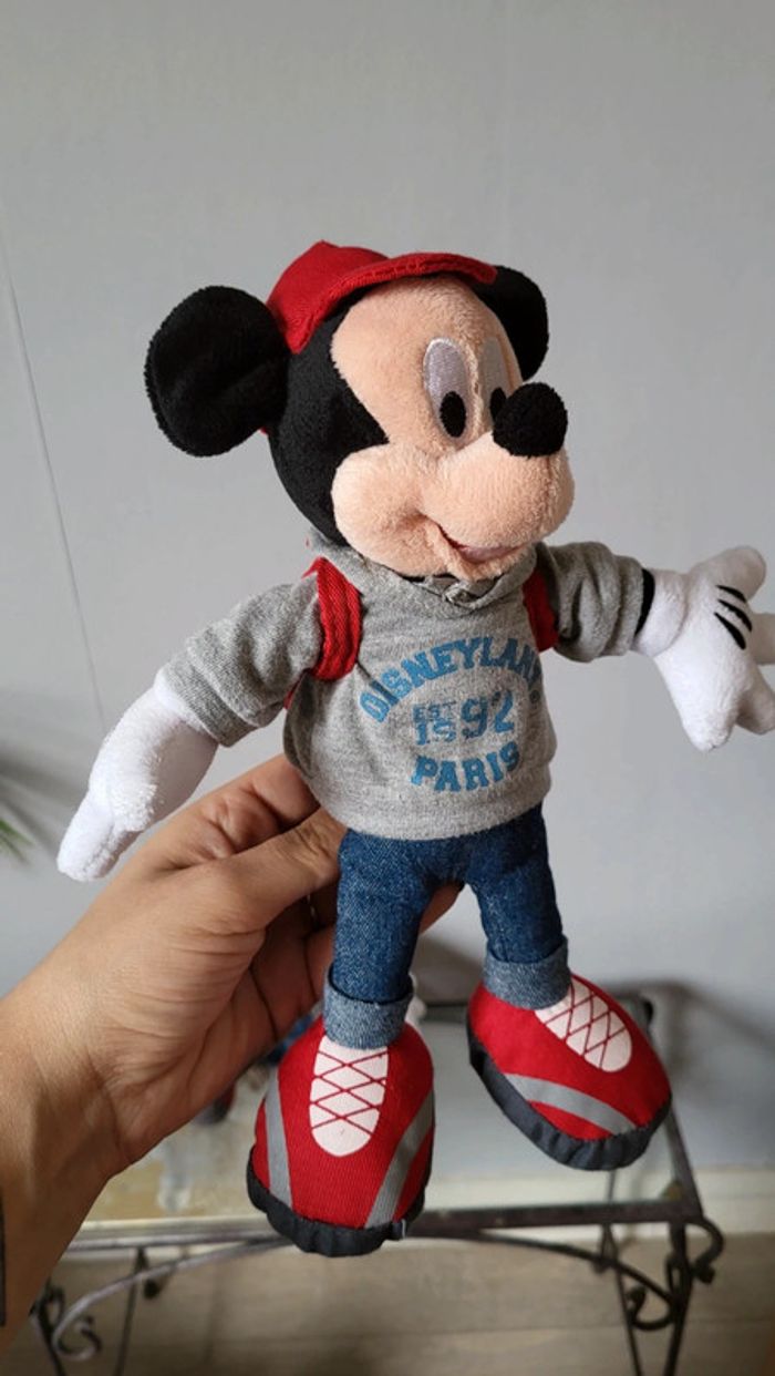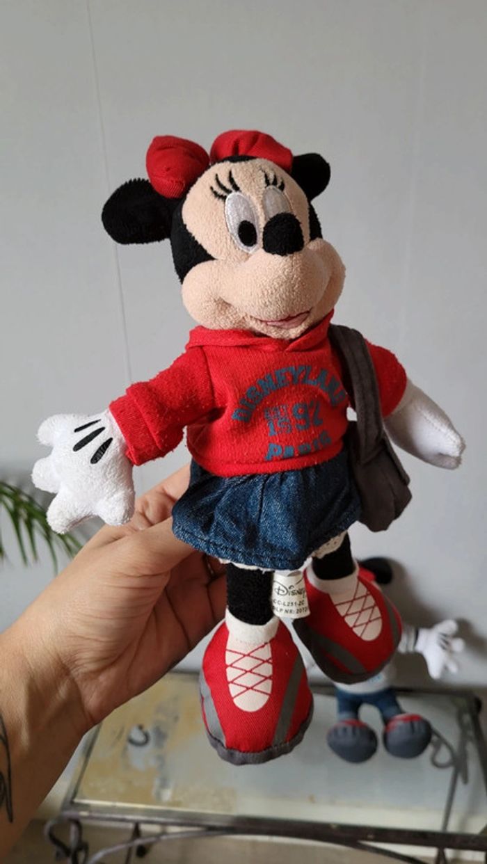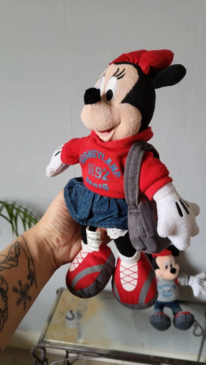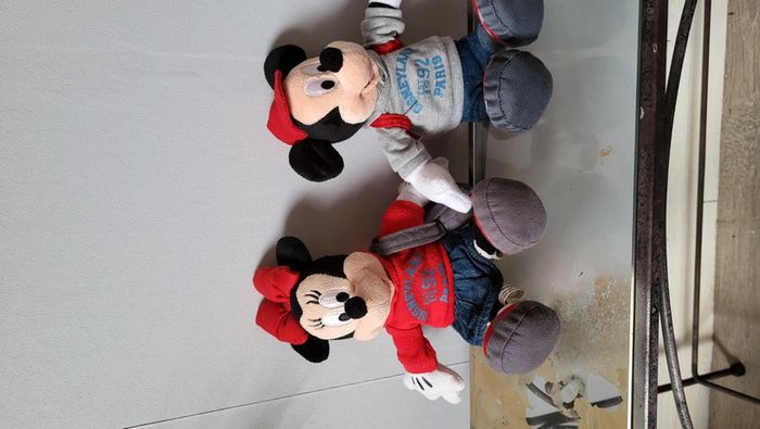 Vends lot de peluches Mickey et Minnie. Produits Disney. Vendus ensemble uniquement. Tenues assorties. Minnie porte un sweat et un sac 1992, Mickey lui porte également un sweat et un sac à dos 1992. Tres bon état. Environ 20 cm