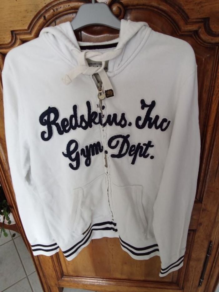 Veste zippée avec capuche et cordon de serrage, blanche, inscriptions en bleu foncé, fermeture éclair, deux poches, Redskins, Authentic range, taille M