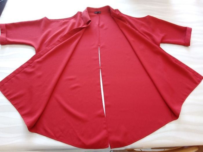 Chemisier rouge de chez River Island, taille 34, 8 boutons, petites manches, épaules découvertes, ouvert dans le dos (3 points). Sympa