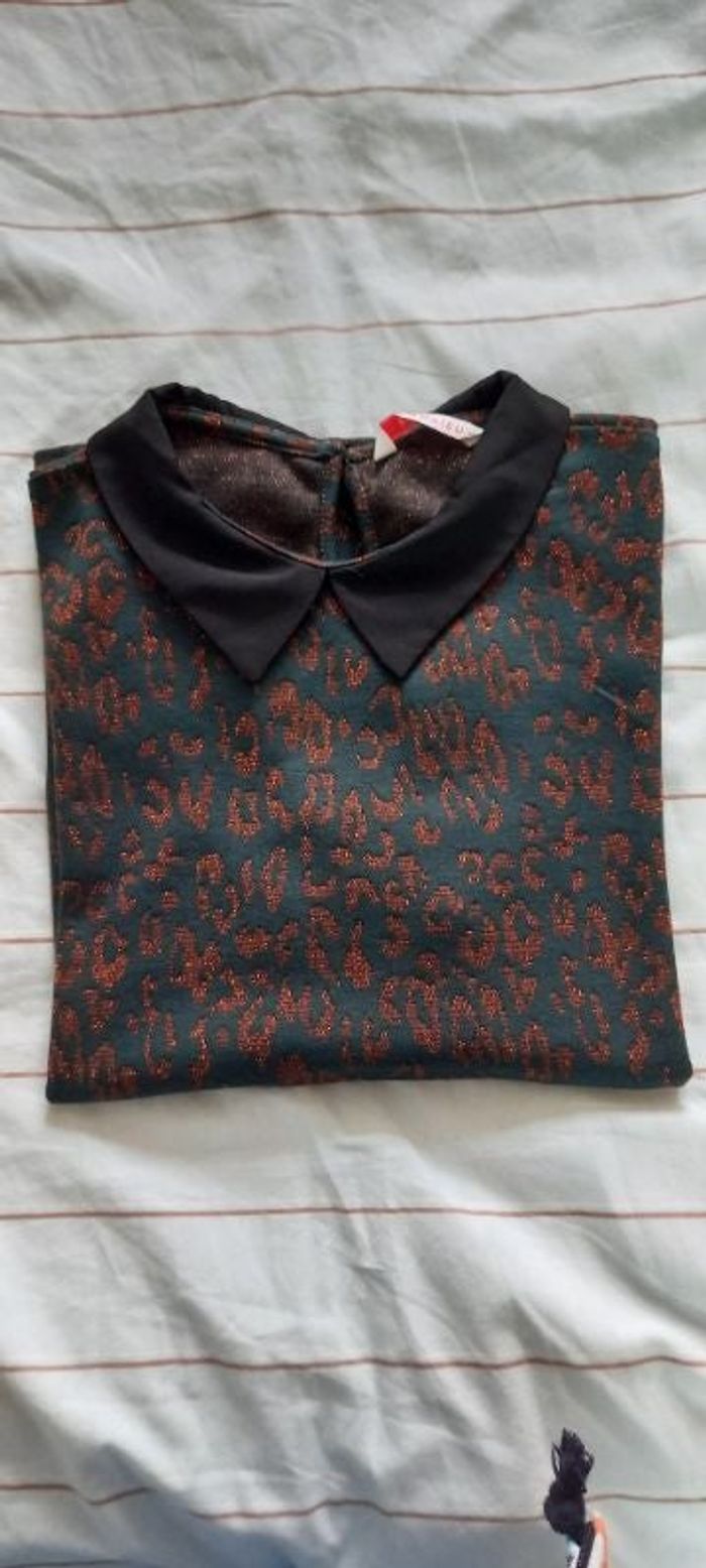 Haut de chez Camaïeu, vert foncé motif brillant, taille L, col noir, bouton en haut du dos