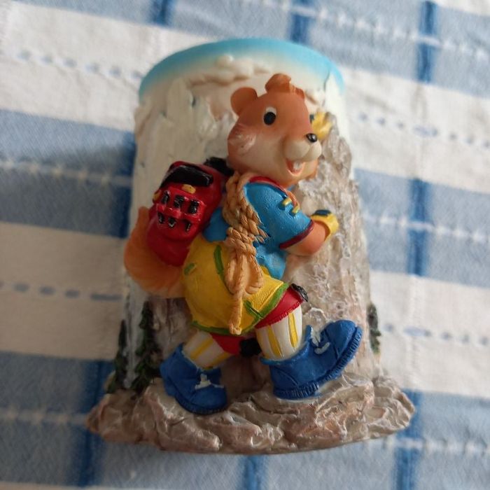 Pot à crayons, en relief : "marmotte à la montagne avec son cartable". Dimensions : 9.5 cm de haut et 6 cm de diamètre