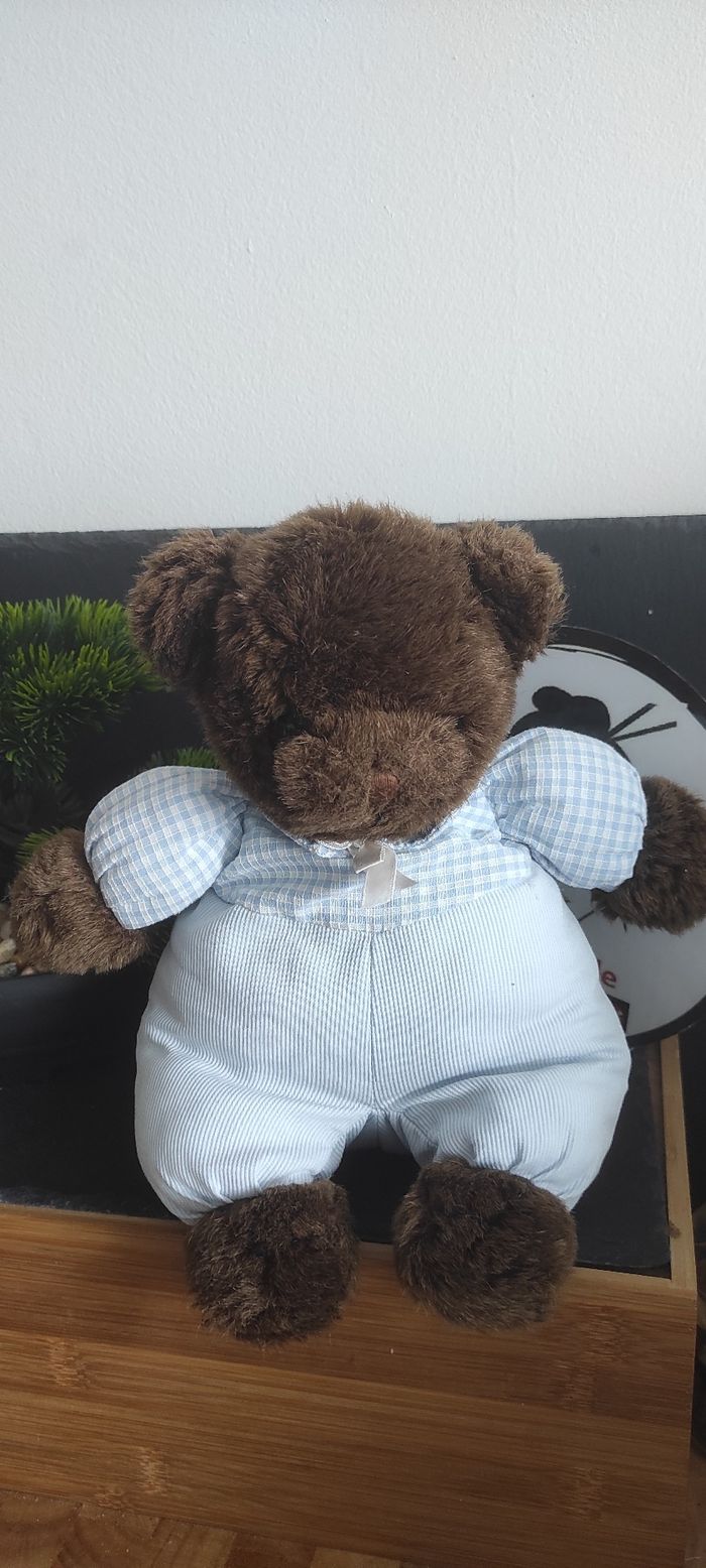 peluche ours brun marron bleu carreaux vichy ancien noeud  Rayure Salopette - photo numéro 1