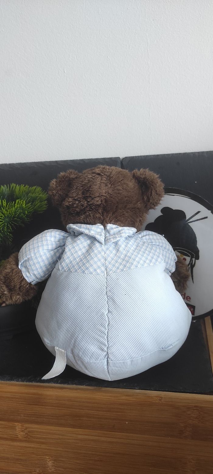 peluche ours brun marron bleu carreaux vichy ancien noeud  Rayure Salopette - photo numéro 3