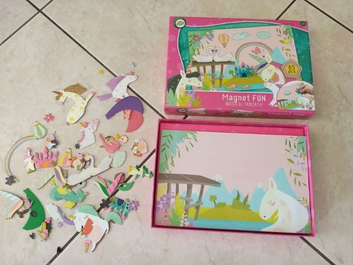 #sev8059jouets jeu MAGNET FUN Jeu magnétique avec la planche magnétique réversible pour créer 2 histoires 61 pièces décoration manque 4 mais ne gêne pas Très bon état peu joué voir mes autres ventes pour regrouper