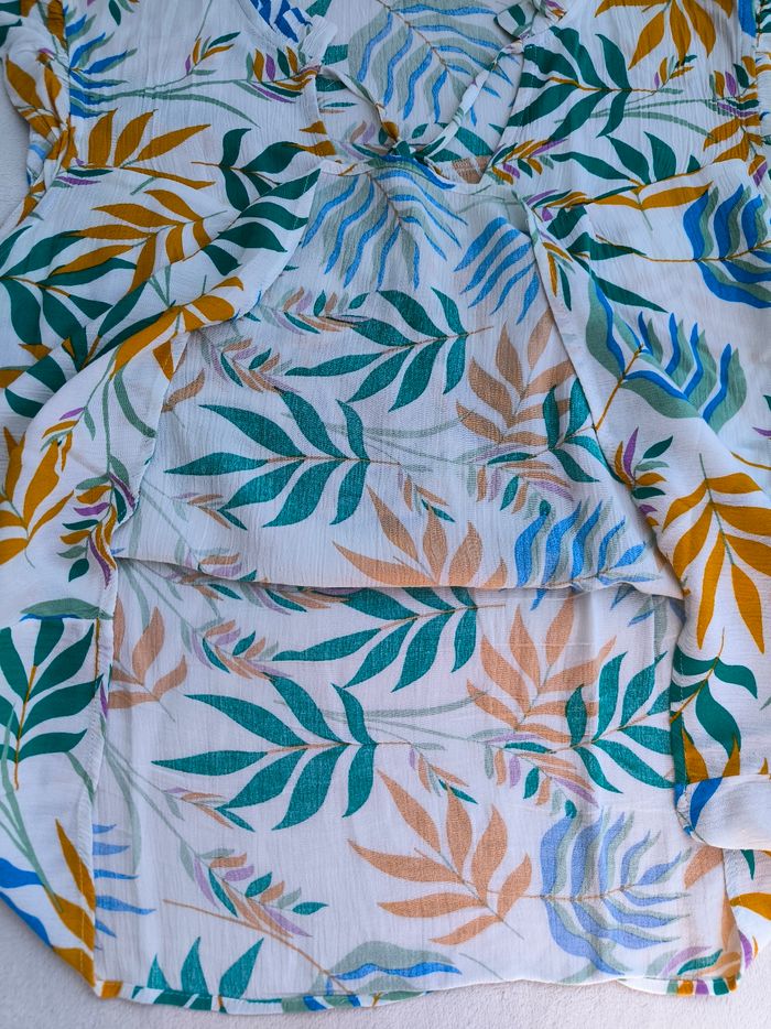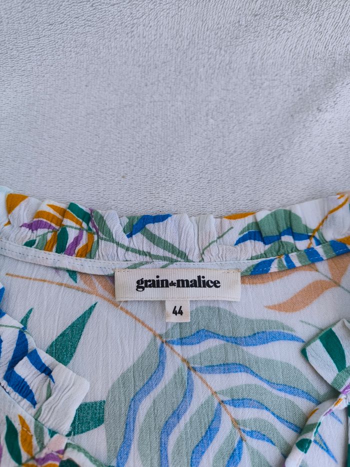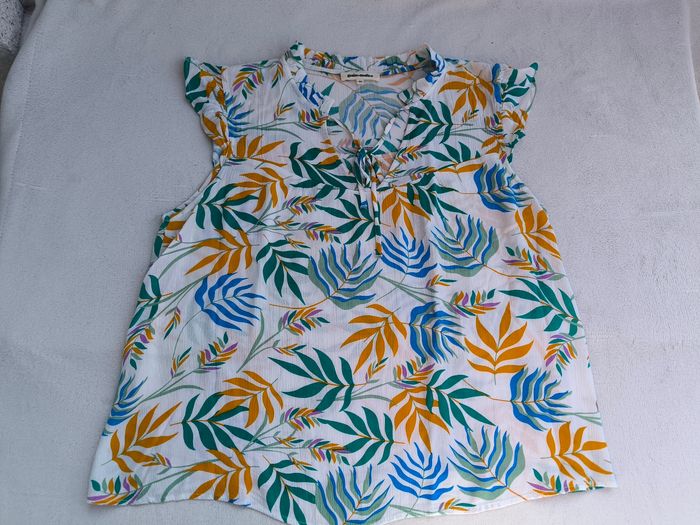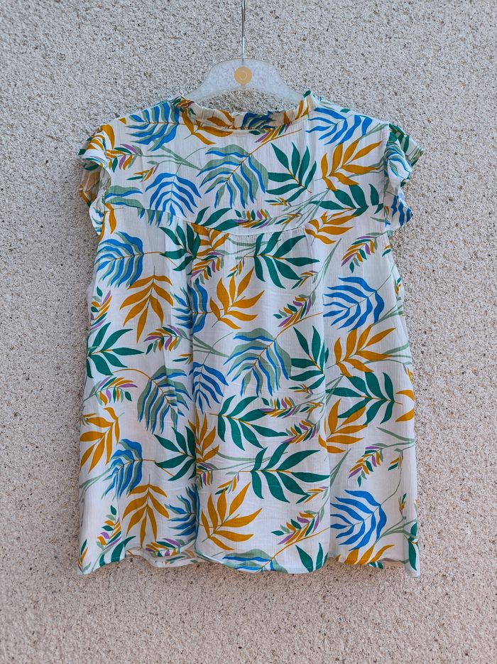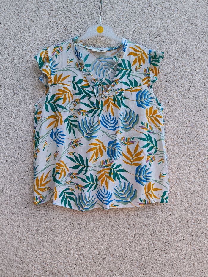 Blouse sans manches Marque Grain de malice Taille 44 • Coloris blanc, bleu, orange, vert (plus clair que sur les photos) • Imprimés feuilles • Col et épaules volantés • Liens à nouer au col • Tissu fin Largeur épaule à épaule non étirée : 41 cm Largeur épaule à épaule étirée au maximum : 45 cm Largeur aisselle à aisselle non étirée : 54 cm Largeur aisselle à aisselle étirée au maximum : 65 cm Longueur totale : 63 cm Longueur aisselle : 36 cm Peu portée, en très bon état #evelyne_taille_44
