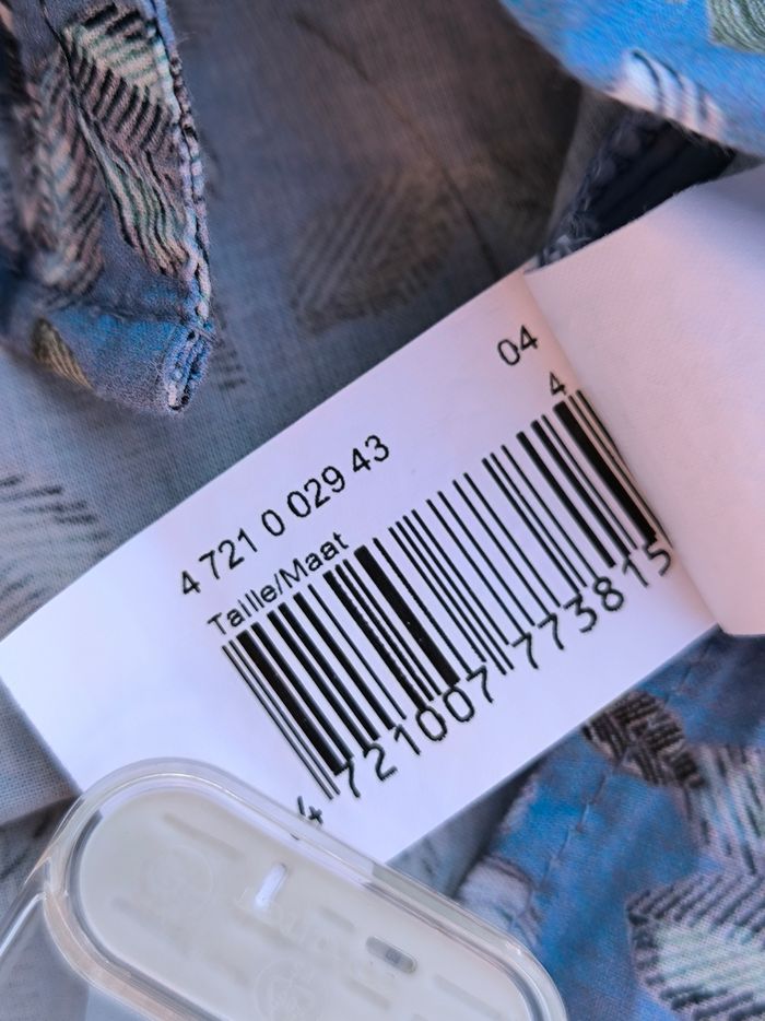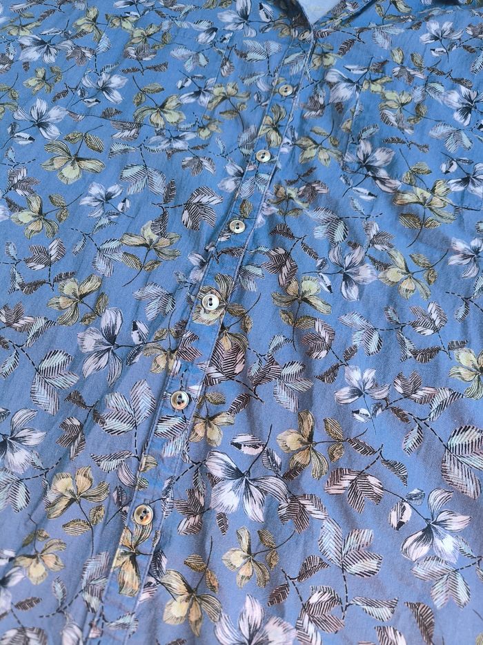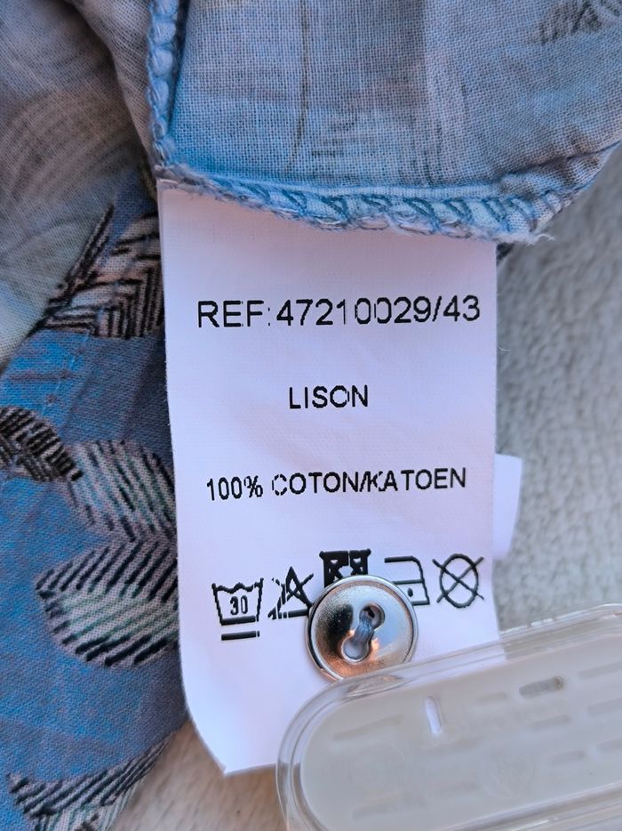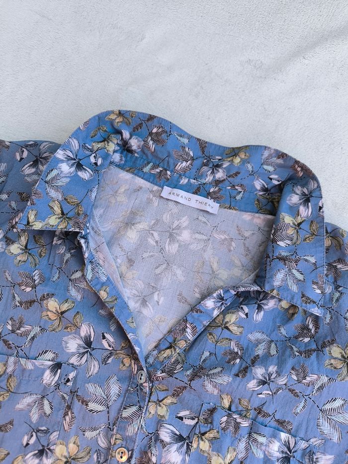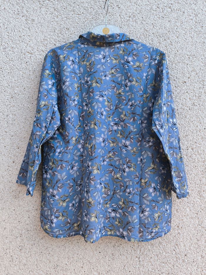Chemise à manches 3/4 Marque Armand Thiery Taille 4, 44-46 • Coloris bleu, blanc, vert • Imprimés feuilles • Fermeture par boutons • 2 poches supérieures • Manches rétractables avec bouton • Coton fin Largeur épaule à épaule non étirée : 44 cm Largeur épaule à épaule étirée au maximum : 48 cm Largeur aisselle à aisselle non étirée : 55 cm Largeur aisselle à aisselle étirée au maximum : 61 cm Longueur manche : 48 cm Longueur totale : 68 cm Longueur aisselle : 38 cm Comme neuve #evelyne_taille_44 #evelyne_taille_46