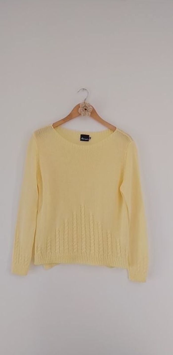 A vendre joli pull jaune légèrement ajouré. Pull mi-saison. Plus jaune au réel qu'en photo. OK taille 38 à 40 max pr un bel effet. Tbe.
