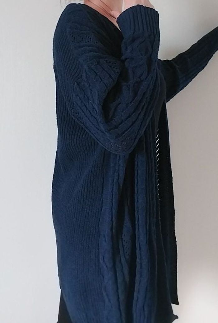 A vendre joli gilet long bleu marine tout doux. Maille chenille. OK 36 à 40. Excellent état.