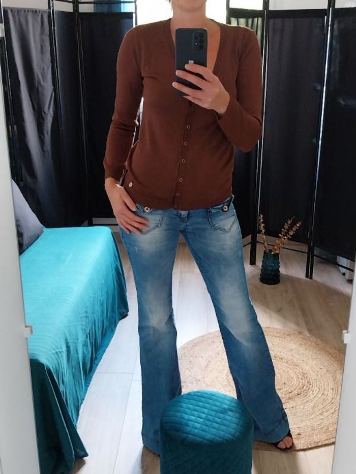 A vendre joli cardigan moka en taille 36. Gilet vendu neuf. Couleur moka brillant et ajouré.