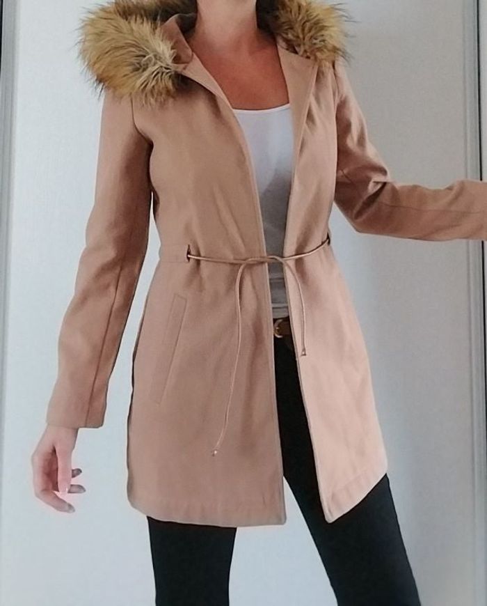 A vendre joli manteau beige de marque Marwa en taille 36. Capuche en fausse fourrure, lien au niveau de la taille. Tbe.