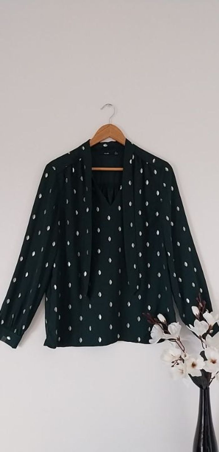 A vendre jolie blouse de couleur vert sapin à motifs dorés. Taille 38 👌. Col en V et lien lavallière, excellent état. Marque Kiabi.
