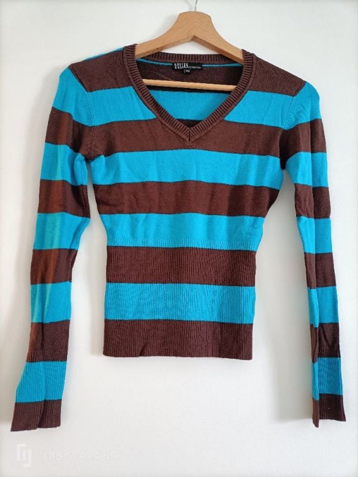 Pull fin moulant col V Rayures marron et turquoise Taille unique 82% viscose 18% elasthanne Largeur 37cm longueur 48 #3