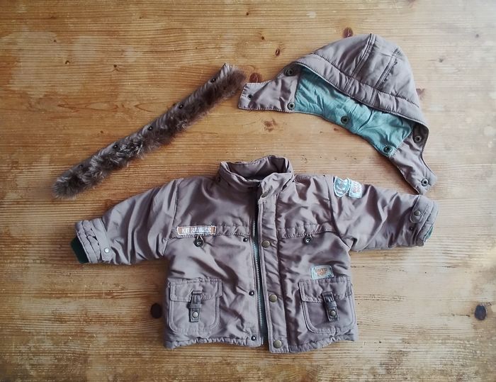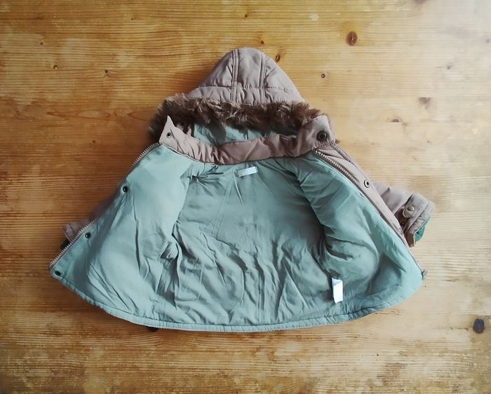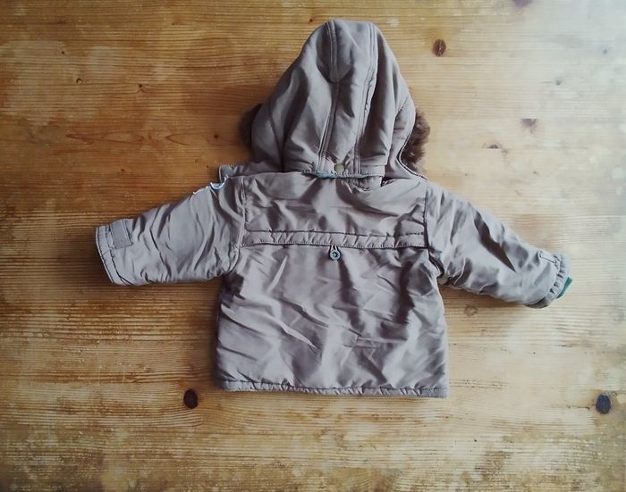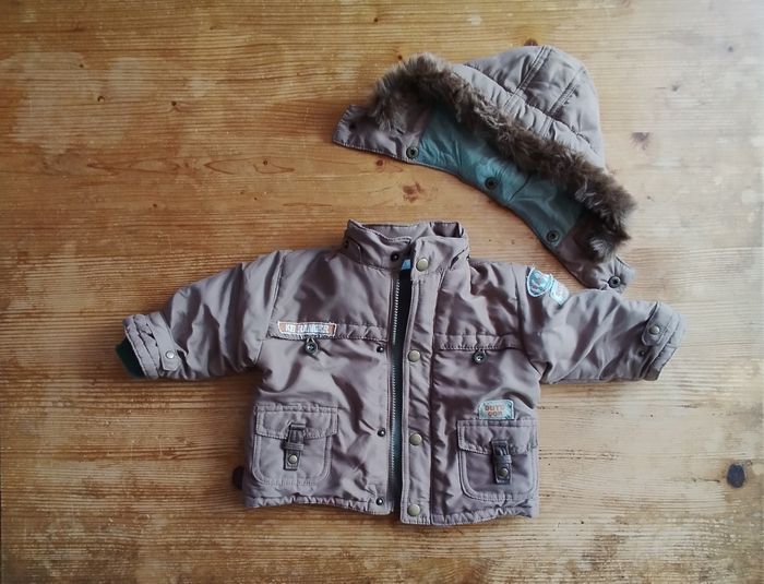 Parka d'hiver pour bébé en très bon état, parfaite pour garder votre enfant bien au chaud ! Taille 6 mois. Comprend une capuche amovible doublée et une bordure en fausse fourrure détachable. Matière extérieure en polyester et doublure intérieure en coton doux pour plus de confort.