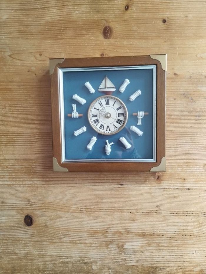 Magnifique horloge murale en bois, au style marin, avec des chiffres romains. Elle est en bon état général et ajoutera une touche d'élégance à n'importe quelle pièce. Elle fonctionne avec une pile LR6 (non incluse). Parfaite pour les amateurs de décoration marine et vintage.