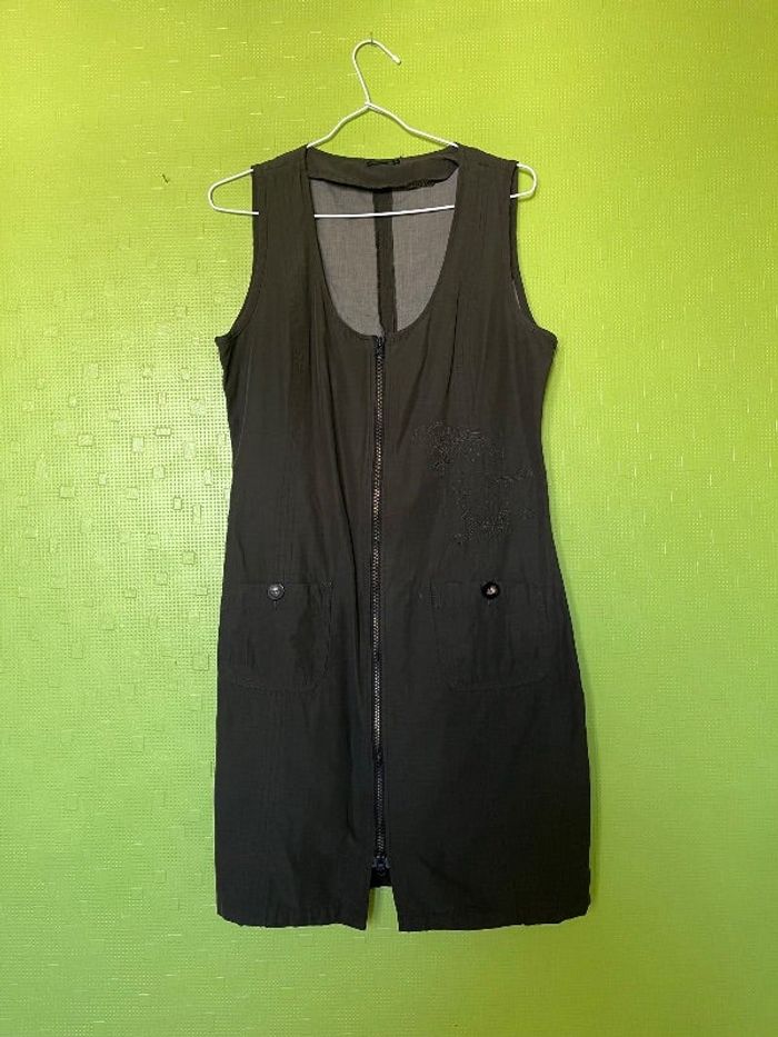 Couleur entre marron Kaki foncé taille estimée à 40 (je porte du 40) En bon état voir toutes les photos, Fermeture éclair s’ouvrant dès deux côtés Textile viscose, coton et polyester (voir étiquette) Dimensions : aisselle à aisselle 48 cm longueur 92 cm. Toute petite tache voir photo Poids 350 g