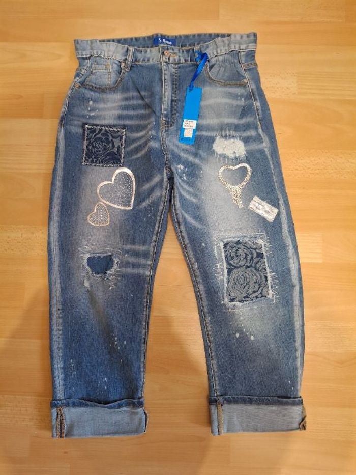 Superbe Jean court pantacourt neuf encore étiqueté Taille XL original avec des empiècements brodés, des strass, des flocages argentés etc...