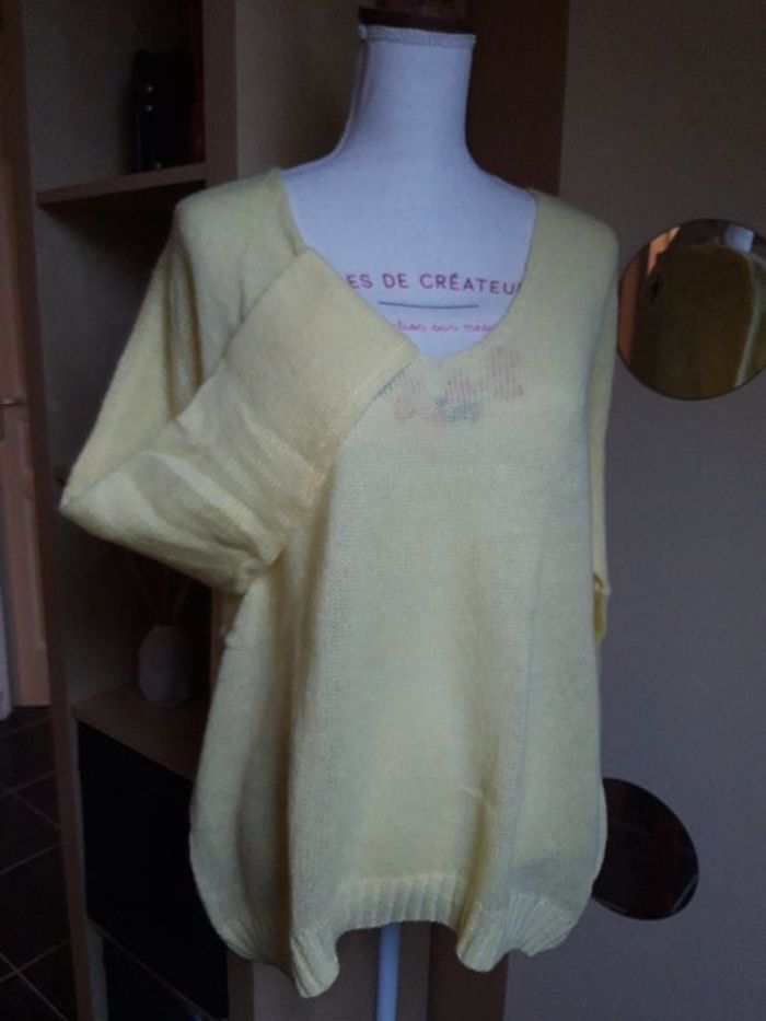 Tres joli pull en mailles couleur jaune pâle encore étiqueté à 34,50€ petite étoile en strass derrière le cou. Taille unique pouvant convenir jusqu'à un 42