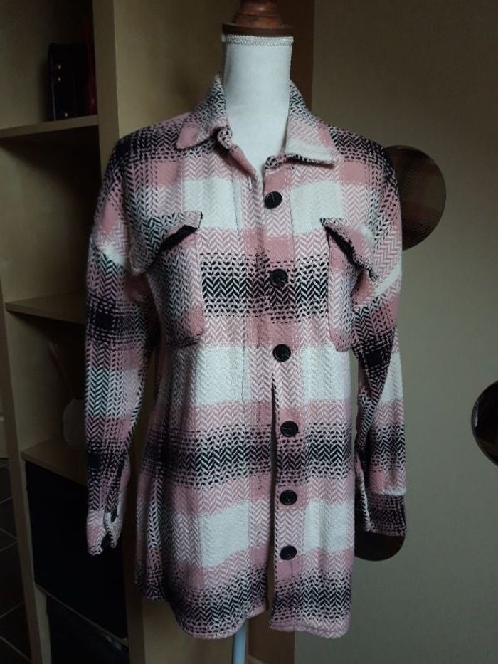 Jolie surchemise épaisse couleur rose à carreaux, taille unique pouvant convenir jusqu'à un 42/44 coupe oversize, en très bon état