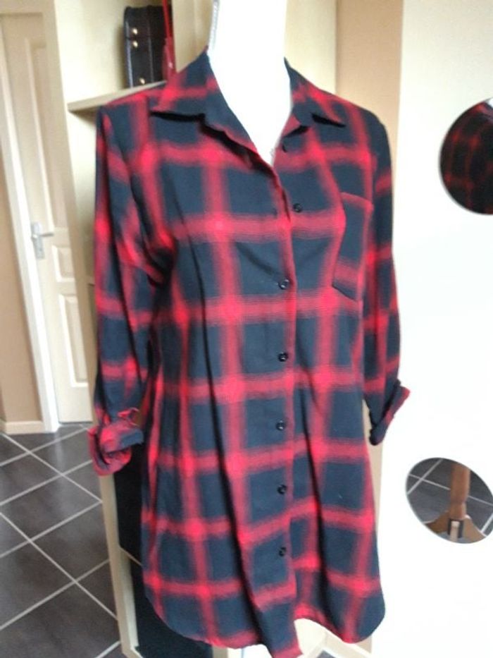 Superbe chemise tunique longue noire et rouge à carreaux style bûcheron, taille unique pouvant convenir jusqu'à un 42 ou plus en la portant ouverte sur un top. Peu portée donc en excellent état