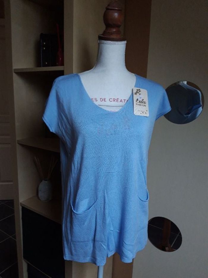 T shirt manches courtes en mailles fines, neuf étiqueté, taille unique, couleur bleu ciel