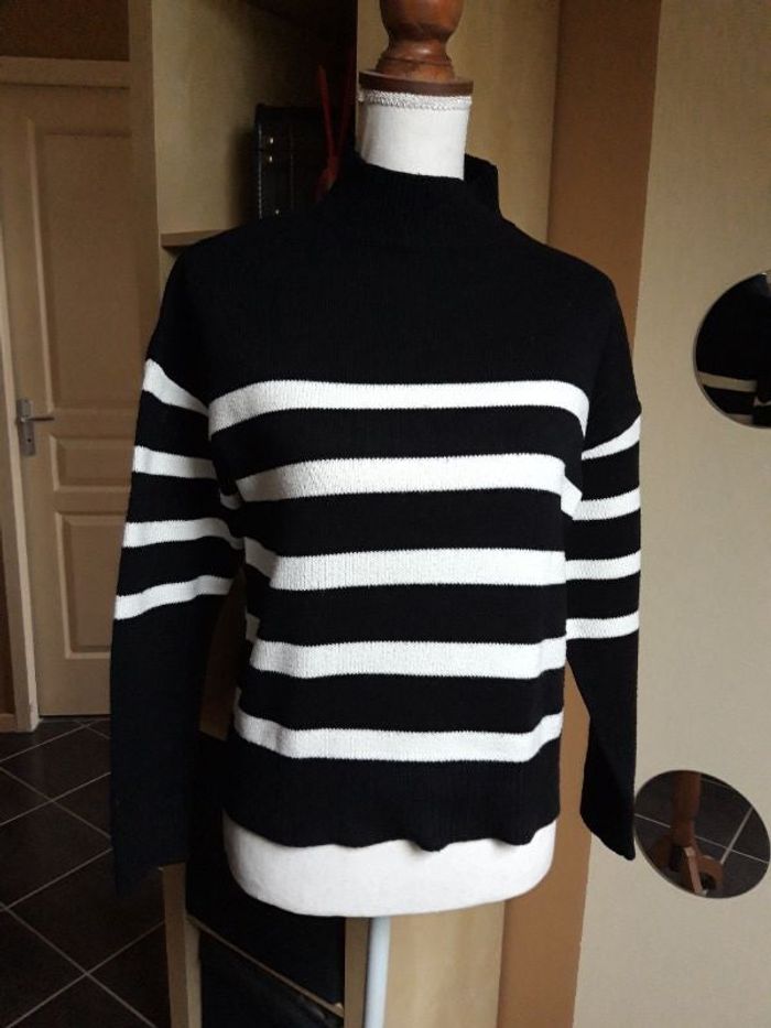 Pull col montant noir et blanc style marinière, en bon état, l'étiquette a été coupée mais c'est une taille S