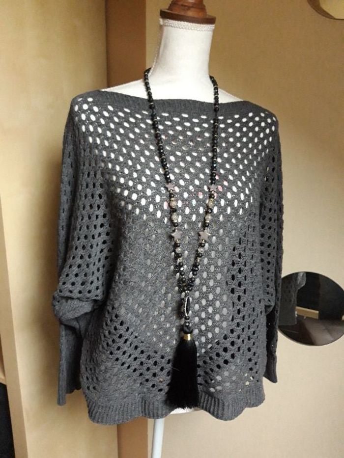 Joli pull tout en maille ajourée à porter en superposition. Couleur gris anthracite, taille unique, peu porté en excellent état