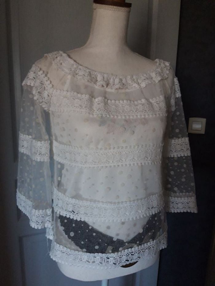 Ensemble 2 pièces composé d'une Jolie blouse tout en dentelle vendue avec un débardeur blanc. Taille S/M mais je dirais qu'elle taille plus S que M. Excellent état, peu portée