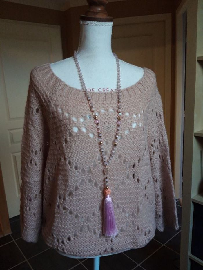 Tres joli pull maille ajourées couleur vieux rose il est neuf et n'a jamais été porté, il est doux, très joli porté sur une chemise longue blanche, taille unique pouvant convenir jusqu'à un 42, col bateau et coupé oversize