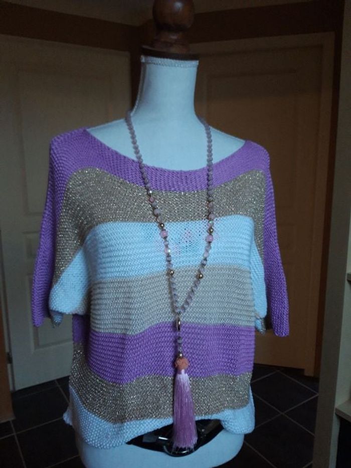 Joli pull en maille col bateau de couleur blanc beige parme et doré. Taille unique pouvant convenir jusqu'à un 42. Neuf il n'a jamais été porté