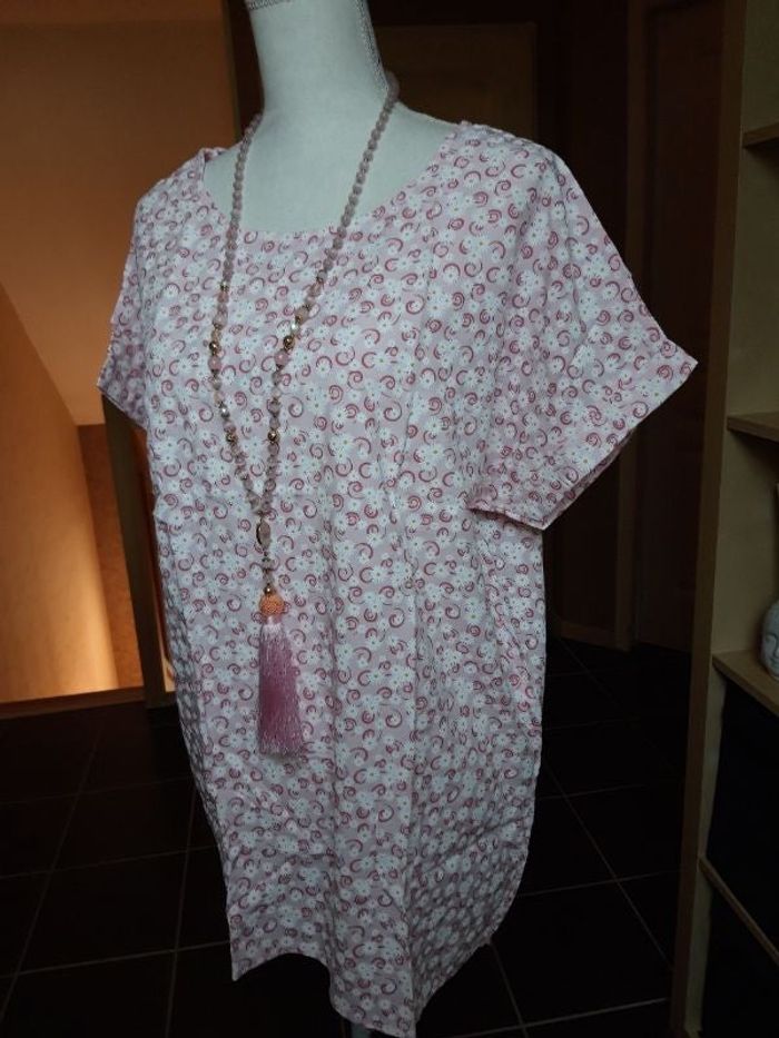 Très jolie tunique dans les tons roses avec motifs spirale et marguerite, neuve encore étiquetée, taille unique pouvant convenir jusqu'à un 42/44, tissu très agréable