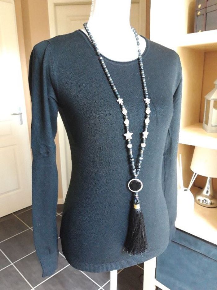 Joli pull fin uni noir simple mais efficace, très agréable au toucher, taille S/M, coupe près du corps. Neuf jamais porté
