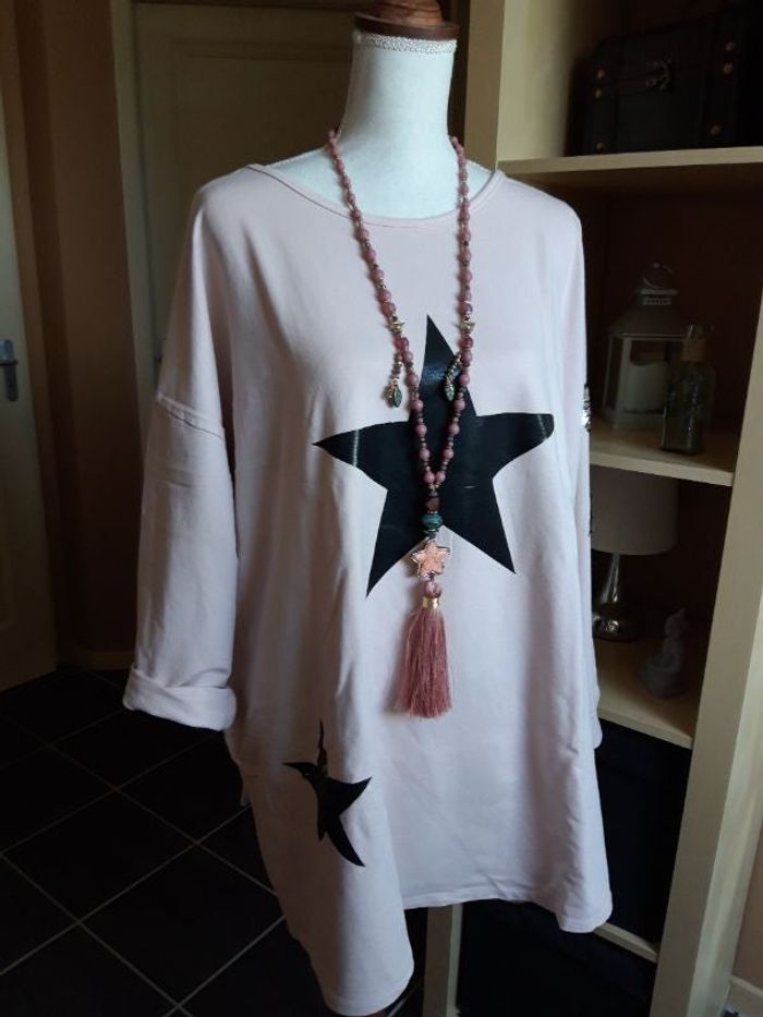 Tres joli sweat tunique en coton pour grande taille ( mais peut aussi être portée oversize ) taille unique made in italy, neuve encore étiquetée, rose poudré avec étoile devant et en sequins sur une manche. Elle est bien large et agréable à porter