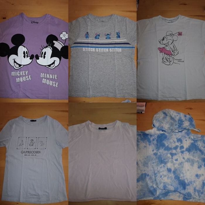 Vends ce lot composé de 6 articles : - t shirt parme mickey minnie disney XS neuf jamais porté - t shirt gris chiné stitch primark disney XS - t shirt blanc minnie disney primark XS peu porté - t shirt bleu ciel capricorne jennyfer XS - t shirt crop top coupe oversize rose clair tally weijl S neuf jamais porté - t shirt à capuche tie and dye bleu et blanc coupe oversize neuf jamais porté, pas de taille indiquée mais se porte large.