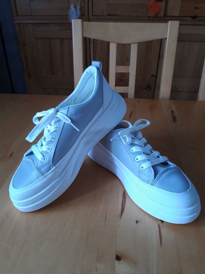 Très jolies baskets tendance , semelles épaisses compensées, simili gris légèrement irisées, elles sont en 39 mais elles conviennent plutôt pour un 38. Très confortables, neuves.