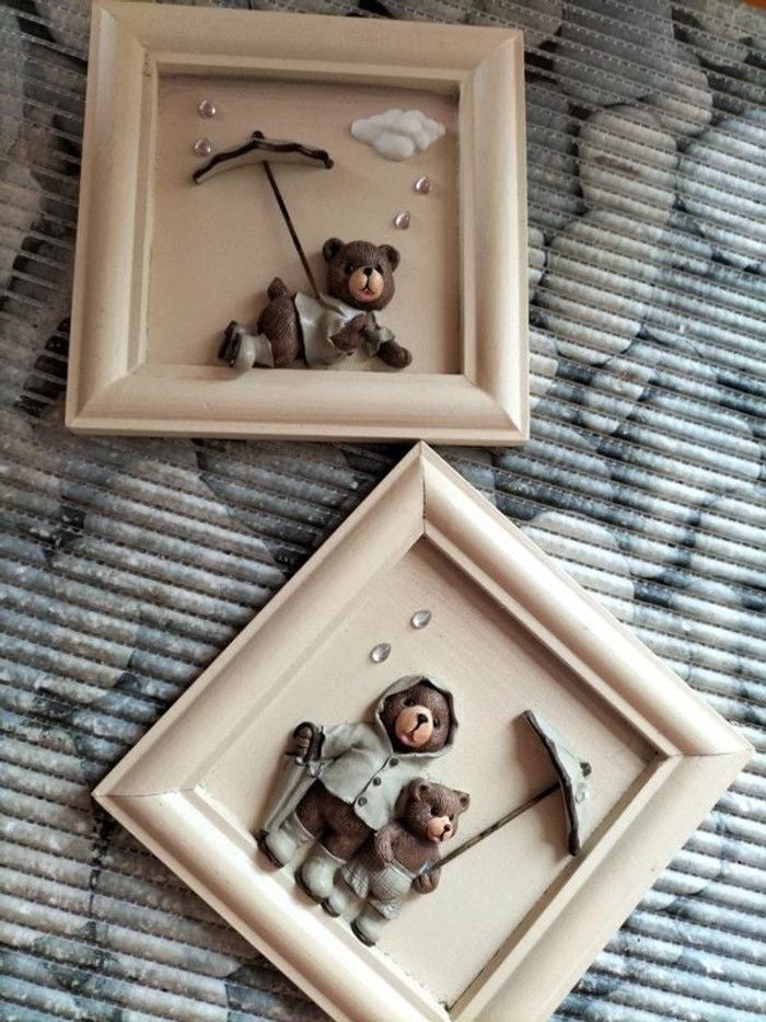 🐻2 cadres Ourson 🐻 🐻2 charmants petit cadres avec des oursons en action avec un parapluie ☂️ Dimensions : 16,50*16,50 centimètres Les 2 ont les mêmes dimensions... Idéals pour mettre dans la chambre d'un enfant Comme Neuf 👌👌