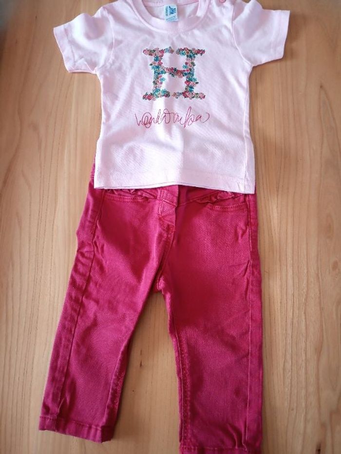 Ensemble tee-shirt et jean rouge bordeaux en très bon état. Le tee shirt n'a jamais été porté