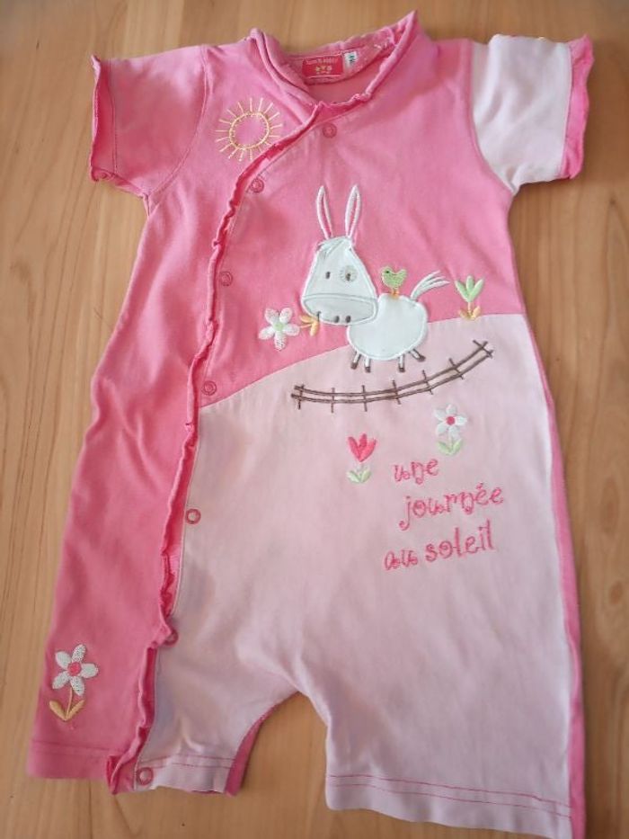 Pyjama été en bon état.indique 24 mois , mais plutôt 12/18 mois . Marque Tom& Kiddy. Très petit défaut ( trou minuscule, pas sur le pyjama)sur la bordure apres les pressions, voir photo.